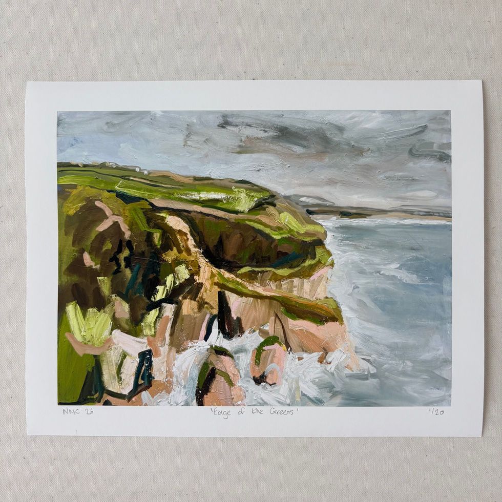 Edge of the Greens captures the meeting point between land and sea along the North Coast - where the neat edge of the golf course gives way to rock, movement, and open water. The reference came from a quiet pause on a drive along the North Atlantic Way, watching waves crash below while my husband and daughter finished ice cream in the car.