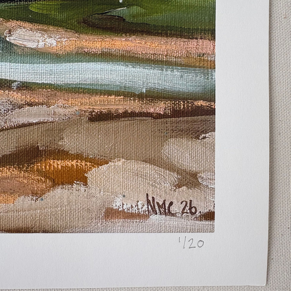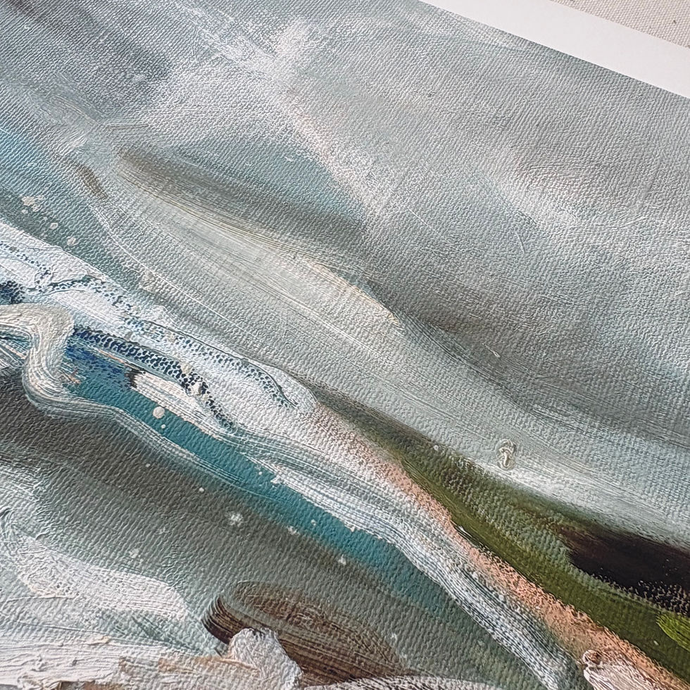 This piece sits in the space where land, water and sky overlap - not fully settled, not in a hurry to resolve. The shoreline is loosely defined, with bands of muted blue, green and sand tones moving horizontally across the surface. Brushstrokes remain visible, giving the painting a sense of movement without pulling focus.