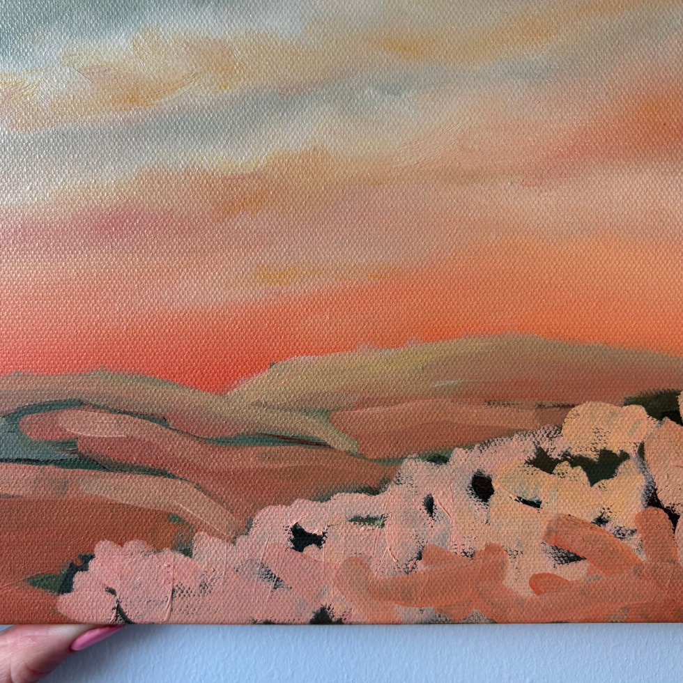 This painting reflects the rolling Italian landscape as the sun sinks low, flooding the hills with deep coral and terracotta light. The foreground bursts with textured warmth, while the sky melts from fiery orange into soft rose and blue, echoing the fleeting glow of dusk. A celebration of place and memory, the work evokes both the grandeur and intimacy of watching day slip into night in the Tuscan hills.
